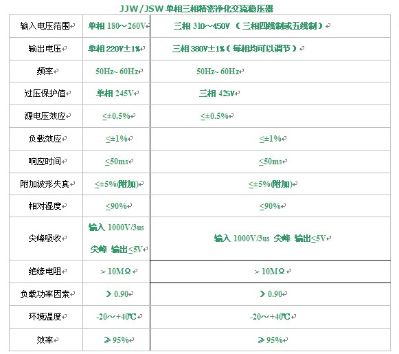 JJW單相/JSW三相精密凈化交流穩(wěn)壓器,采用了國際上先進的正弦能量分配穩(wěn)壓技術(shù)、集穩(wěn)壓、市電凈化功能為一體的高科技新型穩(wěn)壓電源(穩(wěn)壓器),且由正弦能量分配器和大功率濾波器并聯(lián)組成。其設(shè)備是國內(nèi)國外交流穩(wěn)壓技術(shù)的高端產(chǎn)品;具有穩(wěn)壓精度高、動態(tài)響應(yīng)速度快、過載能力高,可靠性好、抗干擾能力強、效率高等優(yōu)點,且能有效的抑制電網(wǎng)的尖峰電壓和各種噪音干擾抗電磁干擾能力強。